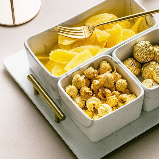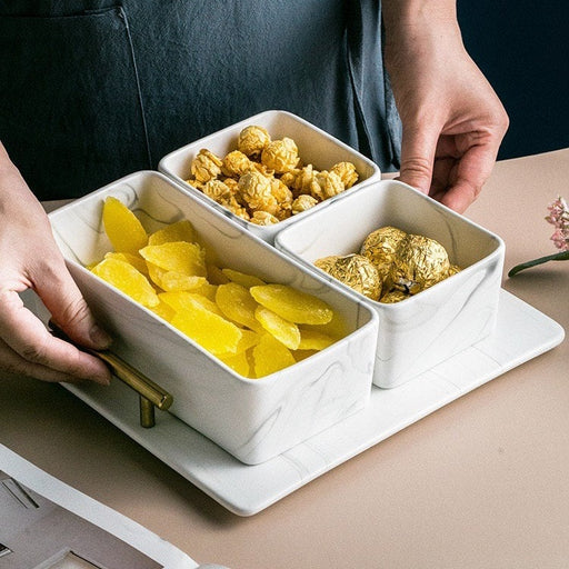 Kallix Snack Bowl Set with Tray   Material: Porcelain Size: 24.8cm x 7.5cm What's in the box? 1 x rectangular snack bowl 2 x square snack bowl 1 x ...